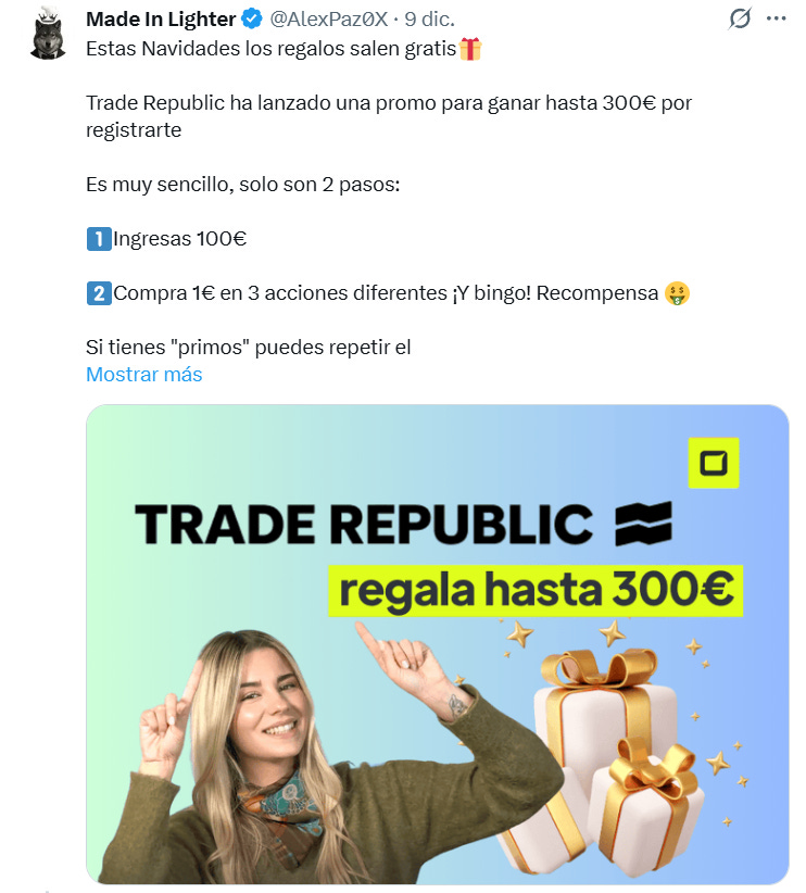 Recuerda registrarte en Trade Republic haciendo clic aquí para reclamar tu acción de hasta 300€. Esta campaña solo está activa hasta el 6 de enero, así que déjalo hecho y termina la semana con una buena victoria.